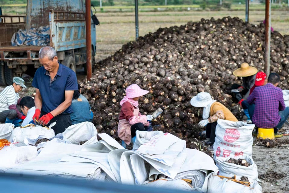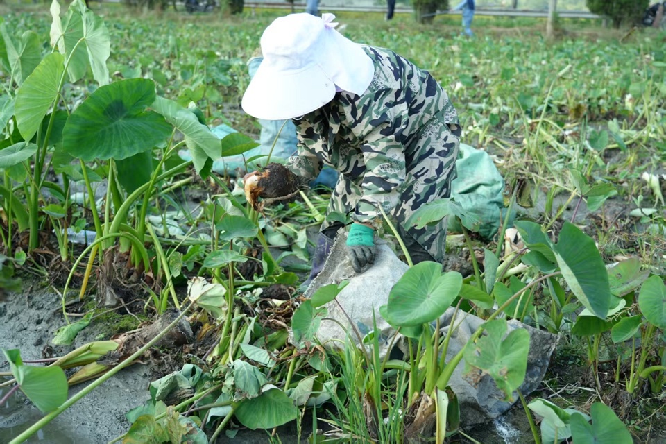 這片400畝的基地,不僅是風景,更是實實在在的“錢景”。據基地負責人李輝軍介紹,今年檳榔芋畝產約3500斤,比去年有了明顯的提升,品質也更為優良。檳榔芋產地價格在每斤2元左右,主要被打捆成件,大批量銷往以芋制品聞名的福建省長汀縣加工廠,被制成芋餃、芋泥、芋頭絲等各式美味佳肴。